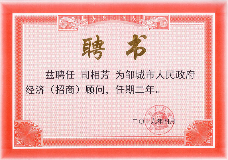 4月24日上午,鄒城市民營經(jīng)濟(jì)發(fā)展大會(huì)召開。山東榮信集團(tuán)司相芳總經(jīng)理被聘請(qǐng)為鄒城市人民政府經(jīng)濟(jì)(招商)顧問,并作表態(tài)發(fā)言。
