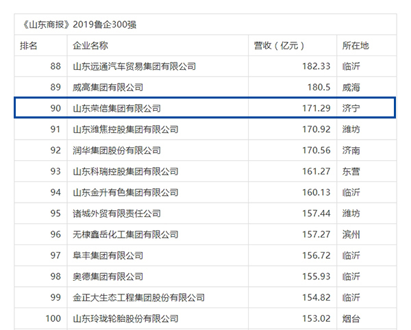 10月29日,“2019魯企300強(qiáng)”榜單發(fā)布,山東榮信集團(tuán)以171.29 億的營(yíng)業(yè)收入位列榜單第90位。